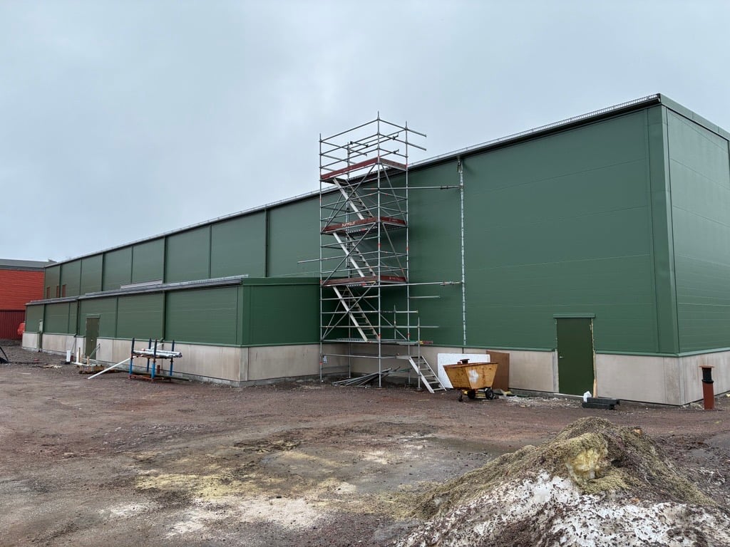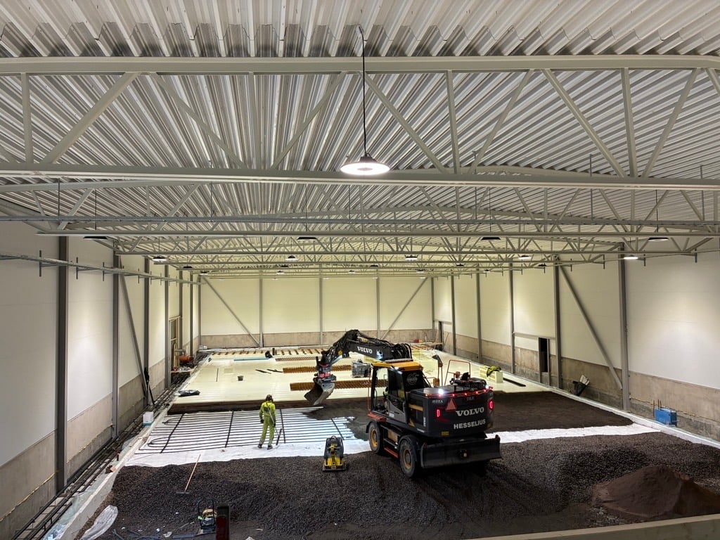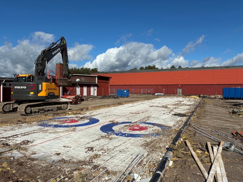 Nu pågår montering av innerväggar, markarbeten, isolering och armering för ispisten. Projektet ska vara färdigt till curlingsäsongen 2026/2027.